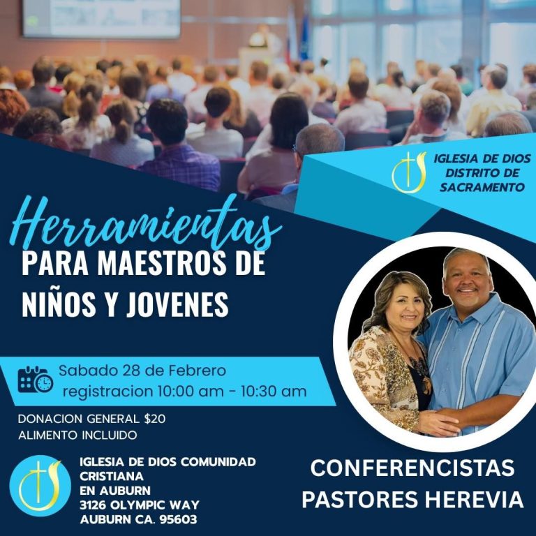 La Iglesia de Dios Comunidad Cristiana en Auburn le invita cordialmente al seminario Herramientas para Maestros de Niños y Jóvenes, el cual será impartido por los Pastores Herevia. Este evento de capacitación se llevará a cabo el sábado 28 de febrero, iniciando con el proceso de registro de 10:00 a.m. a 10:30 a.m. Se solicita una donación general de $20, la cual ya contempla el alimento incluido para todos los asistentes.
