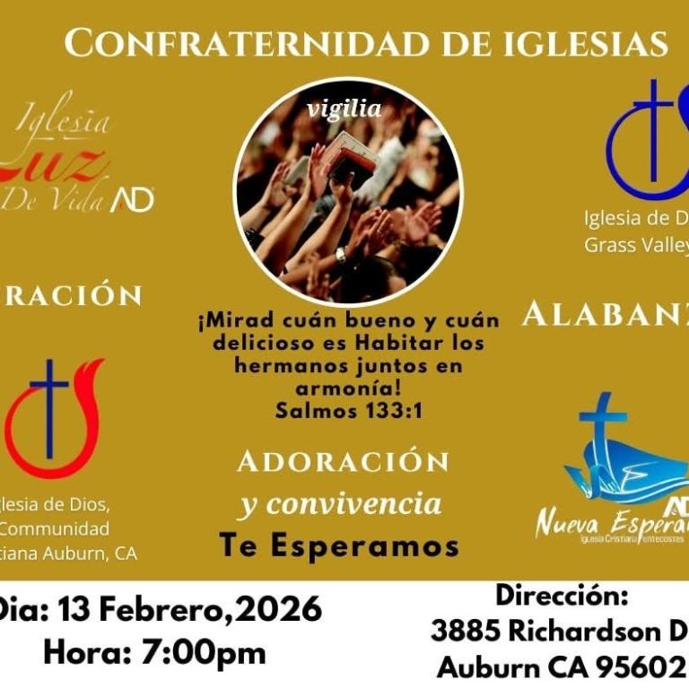 La Confraternidad de Iglesias hace una invitación abierta a toda la comunidad para participar en su próxima vigilia de oración, alabanza y convivencia. Este evento especial se llevará a cabo el día 13 de febrero de 2026 a partir de las 7:00 pm en las instalaciones ubicadas en 3885 Richardson Dr, Auburn, CA 95602. Contaremos con la participación unida de diversas congregaciones locales, incluyendo la Iglesia Luz De Vida, las sedes de la Iglesia de Dios en Grass Valley y Auburn, y la Iglesia Cristiana Pentecostés Nueva Esperanza. Es una oportunidad perfecta para fortalecer nuestra fe y la unidad entre hermanos.
